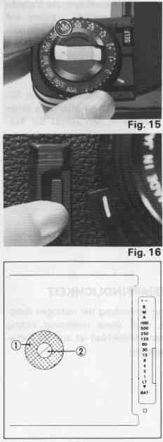 The Liquid Crystal Display such as Shutter Speed Indicator etc. appears in the viewfinder either by pressing Exposure Indication Switch or by releasing the shut ter. After shotting, the power source will cut off automatically after 8 minutes in order to preserve the life of the batteries.(Fig. 16)