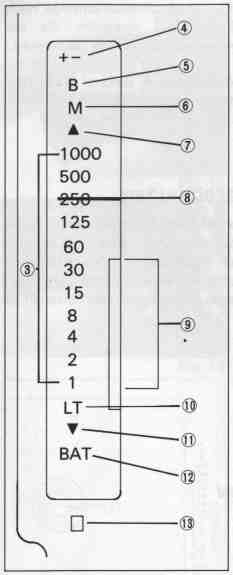 The Shutter Speed, Slow Shutter and Long Time Exposure indications are always pre sent in the viewfinder. The information shown by the activated (Meter-ON) liquid crystal relates to exposure data for the ex isting lighting condidtions.