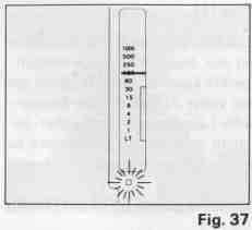 5. Turn the flash unit's power source switch on, and when the flash is fully charged, the Flash Ready (red LED) Light will light up, and the Shutter Speed Indicator will show 1/125 sec. (The correct flash sync. speed) (Fig. 37)