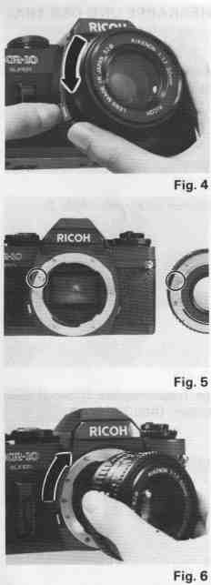 1. Line up the red dot on the lens mount with the matching red dot on the ca mera body, or alternatively, match the red ( I ) mark on the Depth of Field Scale to the red dot on the camera body. (Fig. 5)